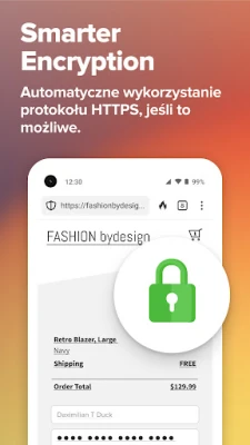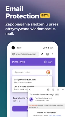 Ochrona Twojej prywatności nie kończy się na przeglądarce. Funkcja ochrony poczty e-mail w DuckDuckGo (beta) pozwala zablokować większość trackerów w wiadomościach i ukryć Twój prawdziwy adres, podczas gdy ochrona przed śledzeniem w aplikacjach rozciąga tę barierę na inne programy na Twoim urządzeniu, działając lokalnie bez zbierania danych osobowych. Masz również pełną kontrolę nad swoimi danymi dzięki ikonicznemu przyciskowi "Zabezpieczenia", który natychmiast usuwa wszystkie otwarte karty i dane. Wbudowana funkcja Global Privacy Control (GPC) pomaga natomiast automatycznie wyrazić Twoje preferencje dotyczące niewsprzedawania ani nieudostępniania Twoich danych osobowych, wspierając Twoje prawa do prywatności.
