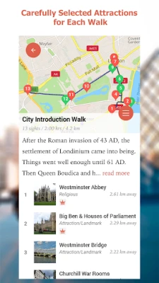 Aplikacja oferuje samodzielne spacery po mieście z mapami tras i nawigacją do głównych atrakcji. Odkrywaj we własnym tempie, bez konieczności dołączania do grup. Ciesz się swobodą zwiedzania, oszczędzając znaczną część kosztów tradycyjnych wycieczek z przewodnikiem.